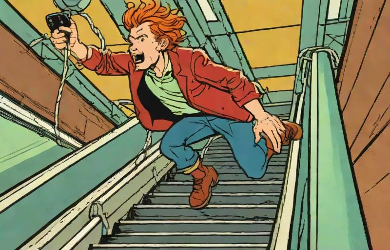 He tugged as hard as he could but the escalator rushed him away and as he realized he was going to lose the cord, his desperate eyes locked in with mine as if to say “You! You can save it. With great power comes great responsibility!”